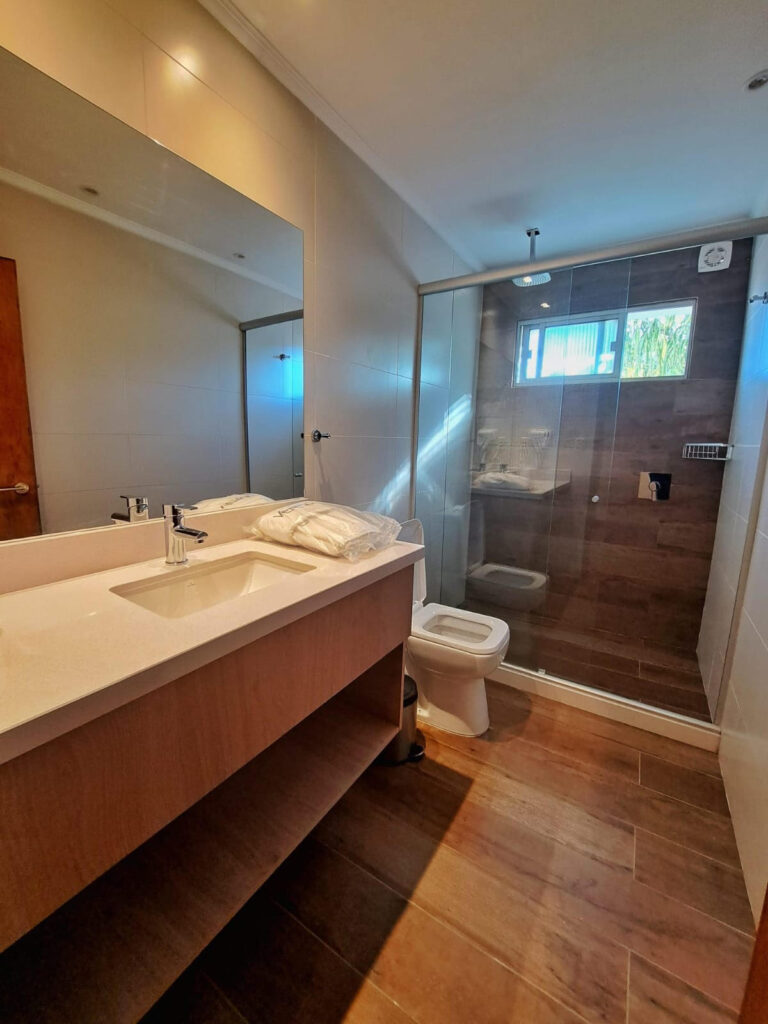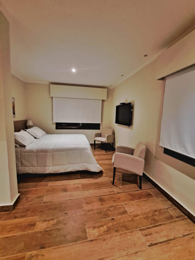 Habitación de 36 mts cuadrados, sommier King y Smart TV de 50″. Luminosa y amplia con una extensa vista a la plaza principal de la ciudad. Ideal para noches de bodas y lunas de miel. En casos especiales incluye un espumante Chandon de regalo.
